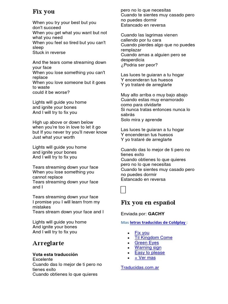 We Have got 6 pics about Fix You Letra Español images, photos, pictures, backgrounds, and more. In such page, we additionally have number of images out there. Such as png, jpg, animated gifs, pic art, symbol, blackandwhite, pics, etc. If you're searching for Fix You Letra Español subject, you have visit the ideal website. Our website always gives you hints for seeing the highest quality picture content, please kindly hunt and locate more enlightening articles and pic that fit your interests.
